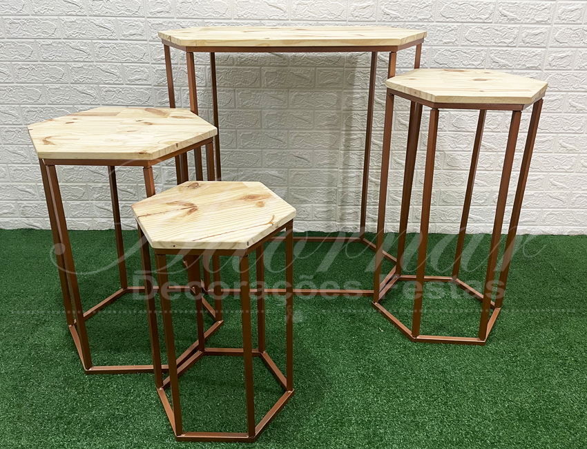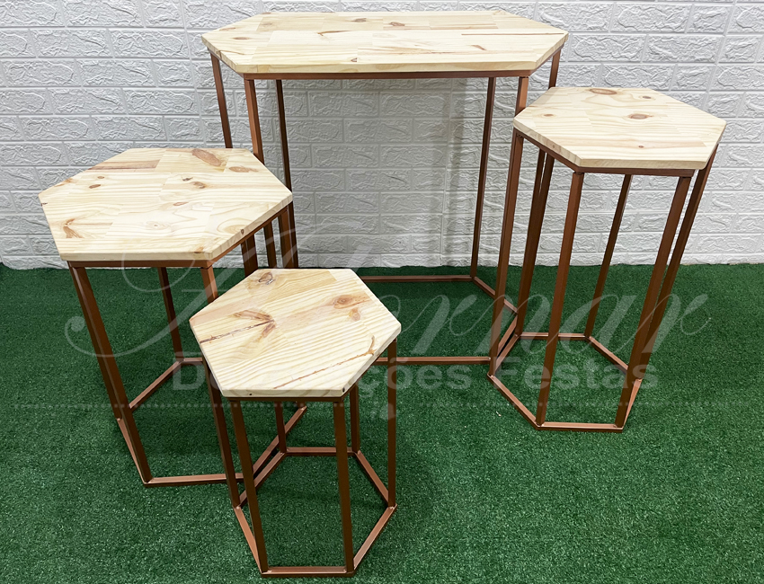 Locação de Kit de Mesa Mini Table Sextavado Rosê Para Decoração de Festa. Este kit de mesa mini table sextavado pode ser usado para várias finalidades de decoração de festas. Exemplos: Para Decorar Com Bolo, Arranjos de Flores, Doces e Artigos Para Festas e Eventos.