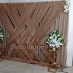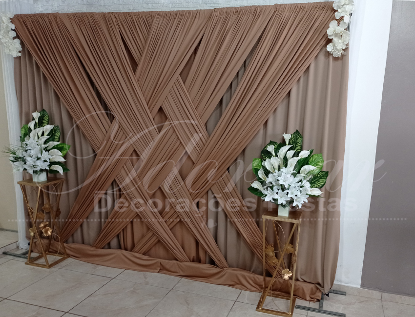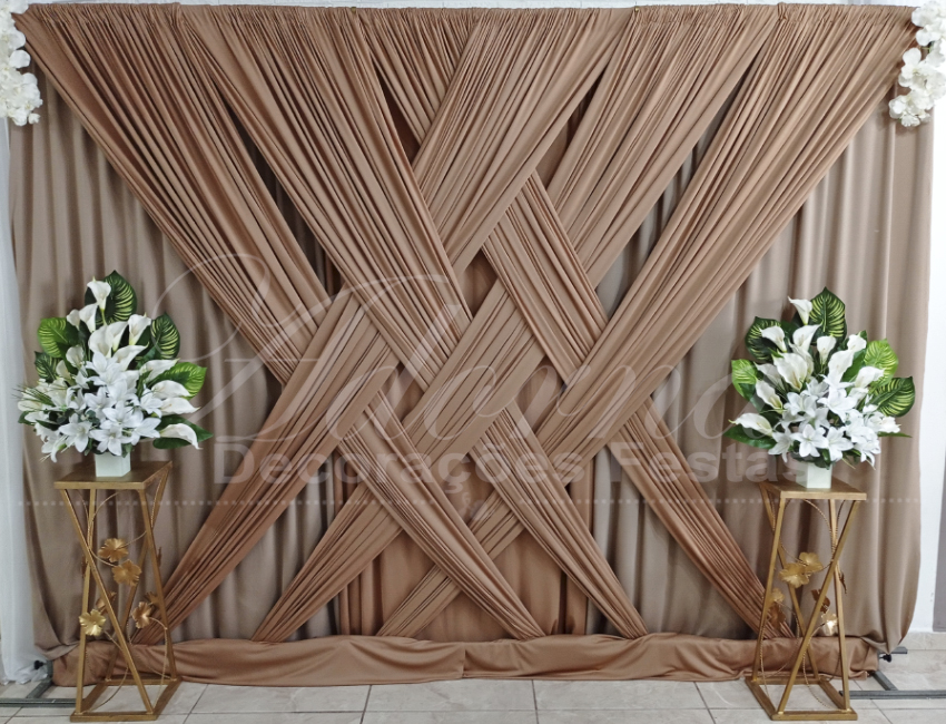 Locação de Painel de Cortinas Trançado Chocolate Suporte Duplo Com Cortinário, Flores Brancas e Colunas de Ferro c/Arranjos de Flores Para Decoração de Festas e Eventos. Painel de Cortinário Com Suporte Duplo Desmontável e Regulagem Ideal Para Colocar Como Fundo de Decorações Ou Em Qualquer Outro Lugar Desejado.