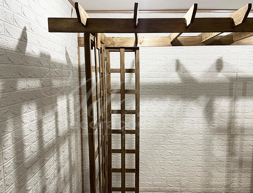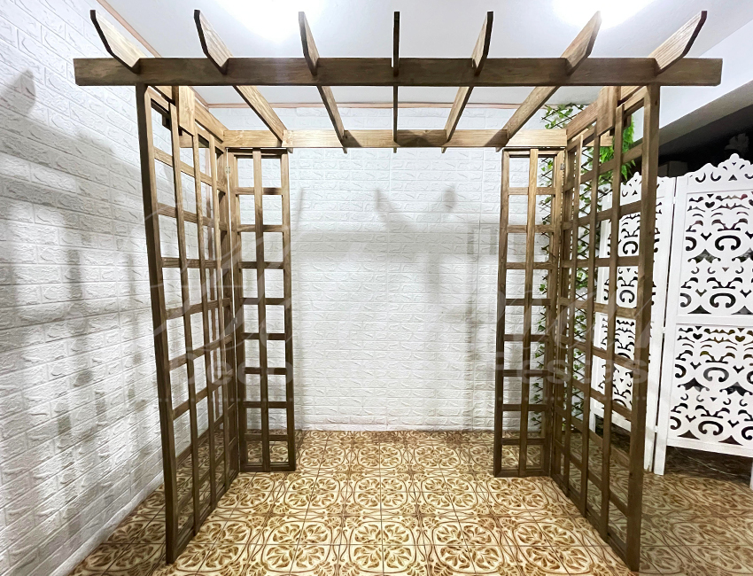 Aluguel Pergolado Treliçado Estrutura. O Pergolado Treliçado em Madeira é uma estrutura versátil e sofisticada para locação, ideal para transformar qualquer evento em um cenário inesquecível. Pode ser utilizado em diversas ocasiões: Casamentos, Decoração ao Ar Livre, Fundo de Cerimônia, Festas, Aniversários, Celebrações, Eventos Corporativos, Espaços Instagramáveis e Jardins. Esse modelo de pergolado possui laterais com treliças, perfeitas para decorar com flores, folhagens, arranjos artificiais, tecidos, luzes decorativas e outros acessórios personalizados. É uma opção charmosa e moderna para decorar entradas, altares de casamento ou cenários fotográficos.